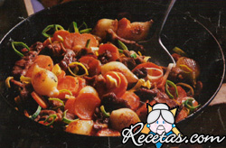 Calentar la panceta en una sartén, agregar la carne de cerdo y las cebollitas y hacerlas dorar, sobre calor vivo.