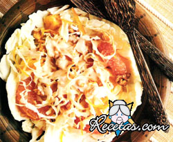 Distribuir la ensalada sobre cada hoja de repollo.