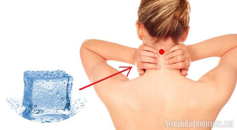 Recuestate boca abajo y colócate un cubito de hielo (aproximadamente 2 x 2 cm) en el punto Feng Fu, ubicado en la base del cráneo, justo debajo de la arista inferior de la tapa del cráneo, en la parte superior del cuello. Se deja allí durante 20 minutos y se sostiene con una bufanda o un vendaje para que no se deslice.
