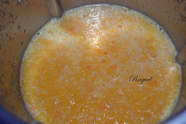 Pelamos las mandarinas y quitamos las telillas esas blancas, esta no tiene pepitas si las tuviera se las quitamos, las trituramos de manera que os guste con mas o menos trocitos.