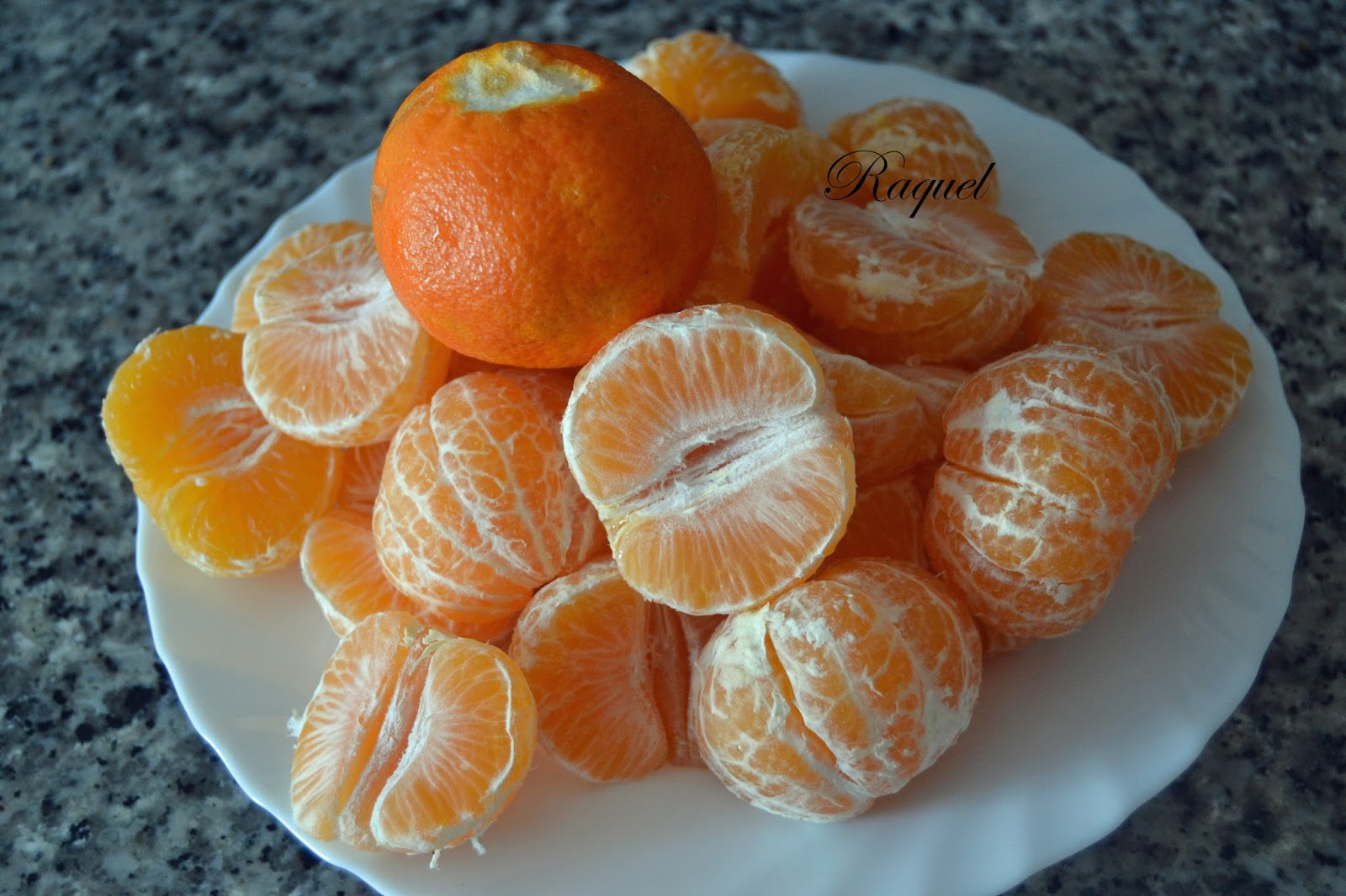 Pelamos las mandarinas y quitamos las telillas esas blancas esta no tiene pepitas si las tuviera se las quitamos.