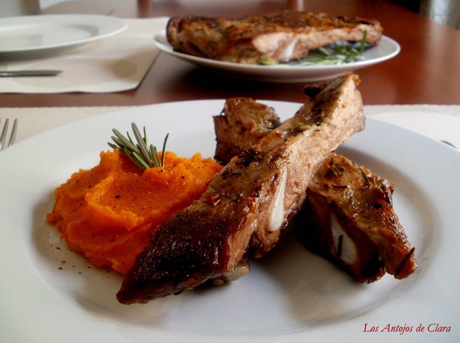 Serví las costillas con un cremoso y ligero puré de calabaza al horno, no me apetecía un acompañamiento muy pesado para una carne rica en grasas. El puré tiene un sabor suave y delicado que combina de maravilla con las costillas; está sazonado con una cucharada de aceite de oliva, pimienta y nuez moscada.