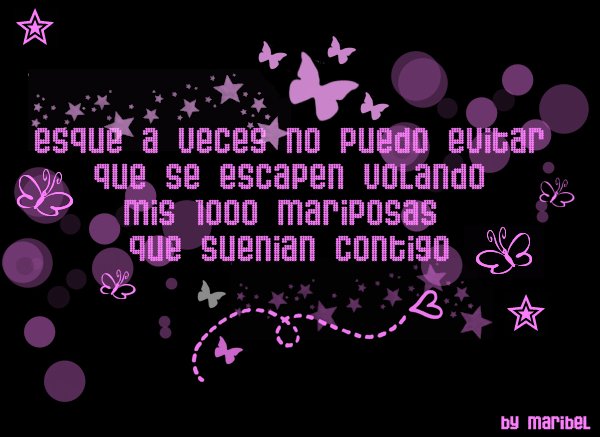 Como estelas de alegria, una dulce compañia, entre notas de grandeza, revolotean en mi mariposas . Como suspiros de un angel, como risas del cielo, mariposas en vuelo, en mi estomago las siento. Dentro de mi, muy dentro de mi, rondan bellas mariposas. Con el sabor del primer beso, mariposas me acarican en tu mirada, tus sonrisas alas entrelazadas. Siento mariposas... Nubecitas blancas, suaves como pompas de javon, como nubes de algodon, siento mariposas juno a ti!!!