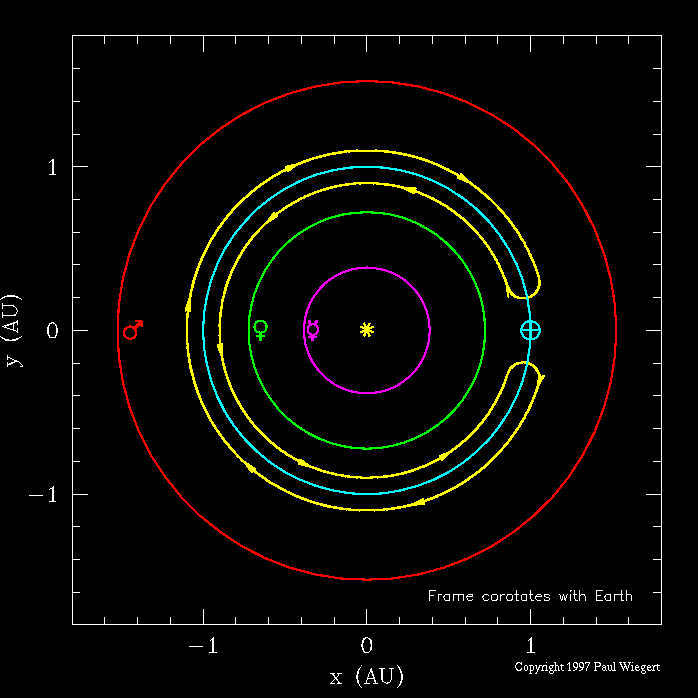 Antes de considerar el movimiento de Cruithne, vamos a examinar una situación menos complicada. Abajo vemos el tipo de órbita en herradura más simple que es posible para un asteroide hipotético. Sólo se muestran las órbitas de los planetas interiores del Sistema Solar. Se los ha identificado con su símbolo tradicional y son, desde el Sol hacia fuera: Mercurio (violeta), Venus (verde), la Tierra (celeste) y Marte (rojo). El recorrido del asteroide se ve en amarillo.