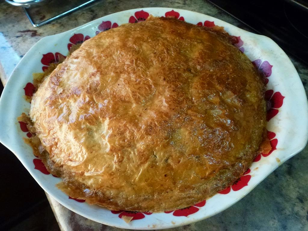 En un recipiente apropiado pintamos con mantequilla el fondo y se va cubriendo con las láminas de pasta filo pintando cada una de ellas con mantequilla, dejando que sobre por los bordes para poder cubrir la masa luego. En el centro se pone toda la masa apretando un poquito, cerrando con los bordes sobrantes, e incluso sobreponemos algunas hojas más que tapen imperfecciones de la empanada y se pinta todo con huevo batido y mantequilla.