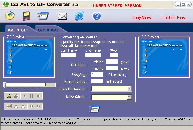 El 123 Avi to Gif Converter versión 3.0 es fácil utilizar y ofrece herramientas de gran alcance que le dejan convertir los clips de Avi a las animaciones del GIF, usted también puede convertir los archivos GIF a archivos Avi. Puede escoger los frames a convertir, velocidad, cambiar el tamaño de las imágenes, etc. Pero ten en cuenta que el video AVI debe de estar descomprimido para que funcione.