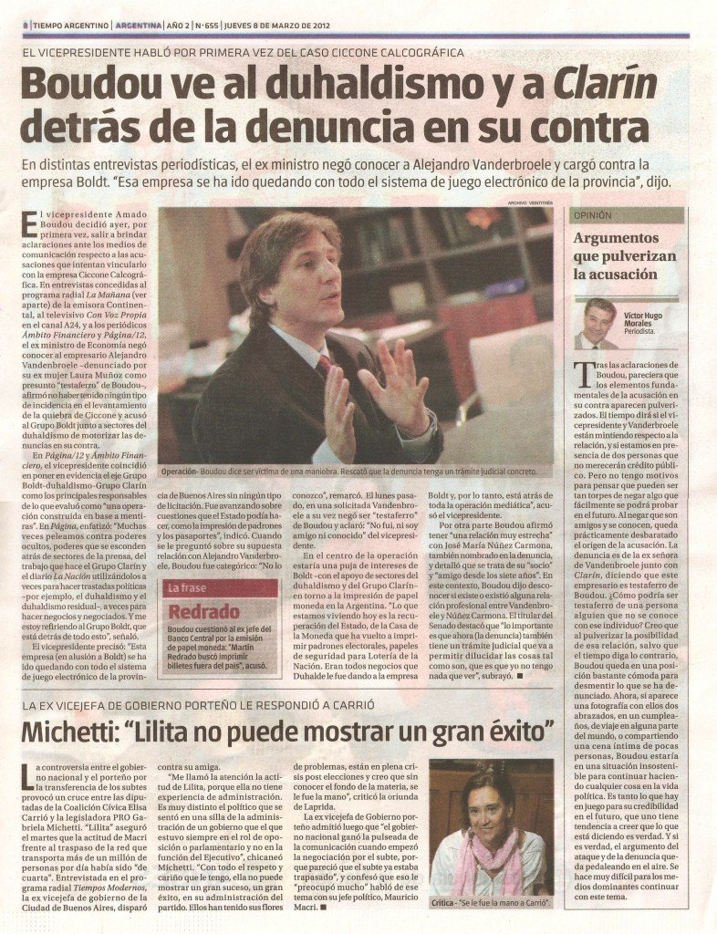 Tras las aclaraciones de Boudou, pareciera que los elementos fundamentales de la acusación en su contra aparecen pulverizados. El tiempo dirá si el vicepresidente y Vanderbroele están mintiendo respecto a la relación, y si estamos en presencia de dos personas que no merecerán crédito público. Pero no tengo motivos para pensar que pueden ser tan torpes de negar algo que fácilmente se podrá probar en el futuro. Al negar que son amigos y se conocen, queda prácticamente desbaratado el origen de la acusación. La denuncia es de la ex señora de Vandenbroele junto con Clarín, diciendo que este empresario es testaferro de Boudou. ¿Cómo podría ser testaferro de una persona alguien que no se conoce con ese individuo? Creo que al pulverizar la posibilidad de esa relación, salvo que el tiempo diga lo contrario, Boudou queda en una posición bastante cómoda para desmentir lo que se ha denunciado. Ahora, si aparece una fotografía con ellos dos abrazados, en un cumpleaños, de viaje en alguna parte del mundo, o compartiendo una cena íntima de pocas personas, Boudou estaría en una situación insostenible para continuar haciendo cualquier cosa en la vida política. Es tanto lo que hay en juego para su credibilidad en el futuro, que uno tiene tendencia a creer que lo que está diciendo es verdad. Y si es verdad, el argumento del ataque y de la denuncia queda pedaleando en el aire. Se hace muy difícil para los medios dominantes continuar con este tema.