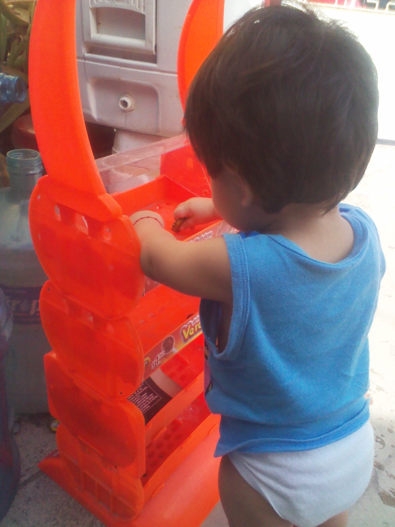 ES UN MUEBLE DONDE PONGO DULCES PARA VENDER PERO EL LO AGARRO PARA JUGAR CON UNAS TAPITAS DE ENVASES