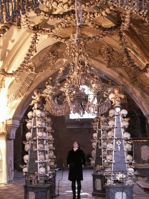 El Osario de Sedlec Este tenebroso lugar se encuentra en una capilla en República Checa, para ser más exactos, en la ciudad de Kutná Hora y contiene 40 mil esqueletos humanos. Estos huesos están dispuestos de forma decorativa para formar el mobiliario de la Iglesia. Según cuenta la historia, una capilla gótica fue construida en un cementerio de una abadía, con lugar para depositar osamentas en el sótano. En 1870, una ilustre familia pagó a un tallista de madera para poner en orden los restos. El resultado es espeluznante, con arañas y todo tipo de muebles hechos de huesos humanos.