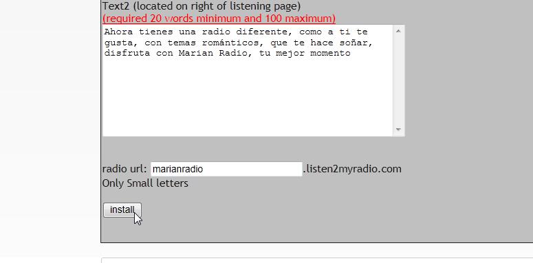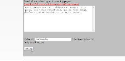2- Después nos pide que le demos un nombre a la radio (tenemos que poner mínimo 5 palabras, es la frase que sale en el navegador ( en mi caso lo primero que se me ocurrió ) Marian Radio tu mejor momento, teniendo 5 palabras nos lo da por valido.