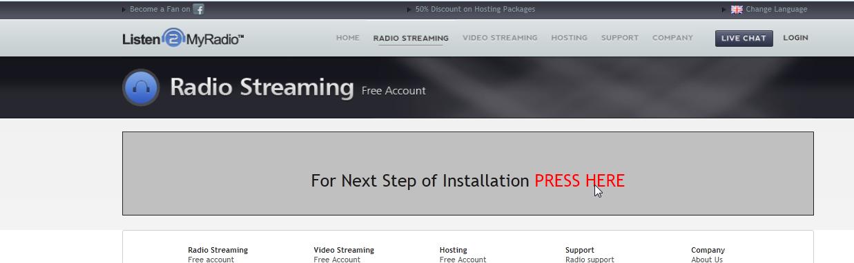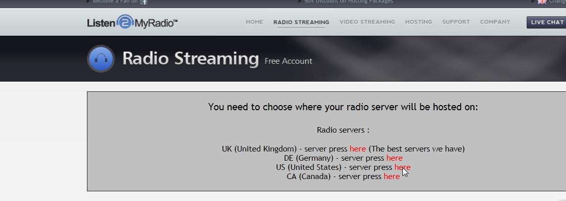 Ahora debemos escoger un servidor dónde alojar nuestra radio, nos recomienda el primero de la lista... pero suelen ser los más saturados, así que escogemos otro y clic en press here