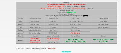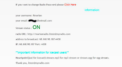 Por fin nuestra radio esta lista... veremos esta ventana, con todas las opciones... como veis la radio esta activada con letras verde fosforito se puede leer Stream is ON, pero si la radio esta unas horas sin usarse se desactiva, quedando en OFF, para volver a activarla, nos logeamos en la página y esta ventana, donde pone Turn ON/OFF, hacemos clic en ON para activarla.