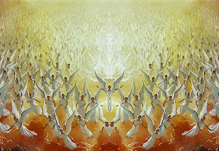 Primera Jerarquía (Estos ángeles de la mas alta jerarquía se dedican exclusivamente a glorificar, amar y alabar a Dios en su presencia). Serafines, Querubines y Tronos.