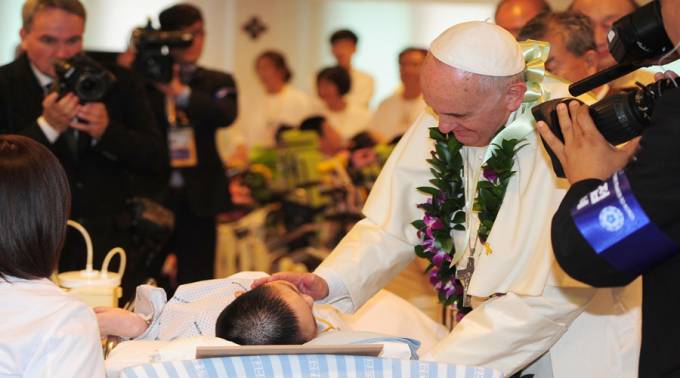 Francisco, después de haberlo abrazado, administró el sacramento a Giuseppe, sentado en la silla de ruedas, donándole una corona del rosario con la recomendación de no olvidar rezar nunca por él.