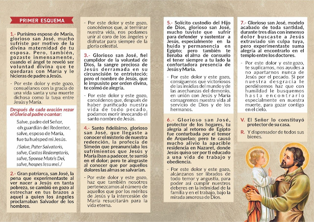 Jaculatoria.-¡Oh glorioso San José! Haced que sea constante en el bien; corregid mis faltas y alcanzadme el perdón de mis pecados.