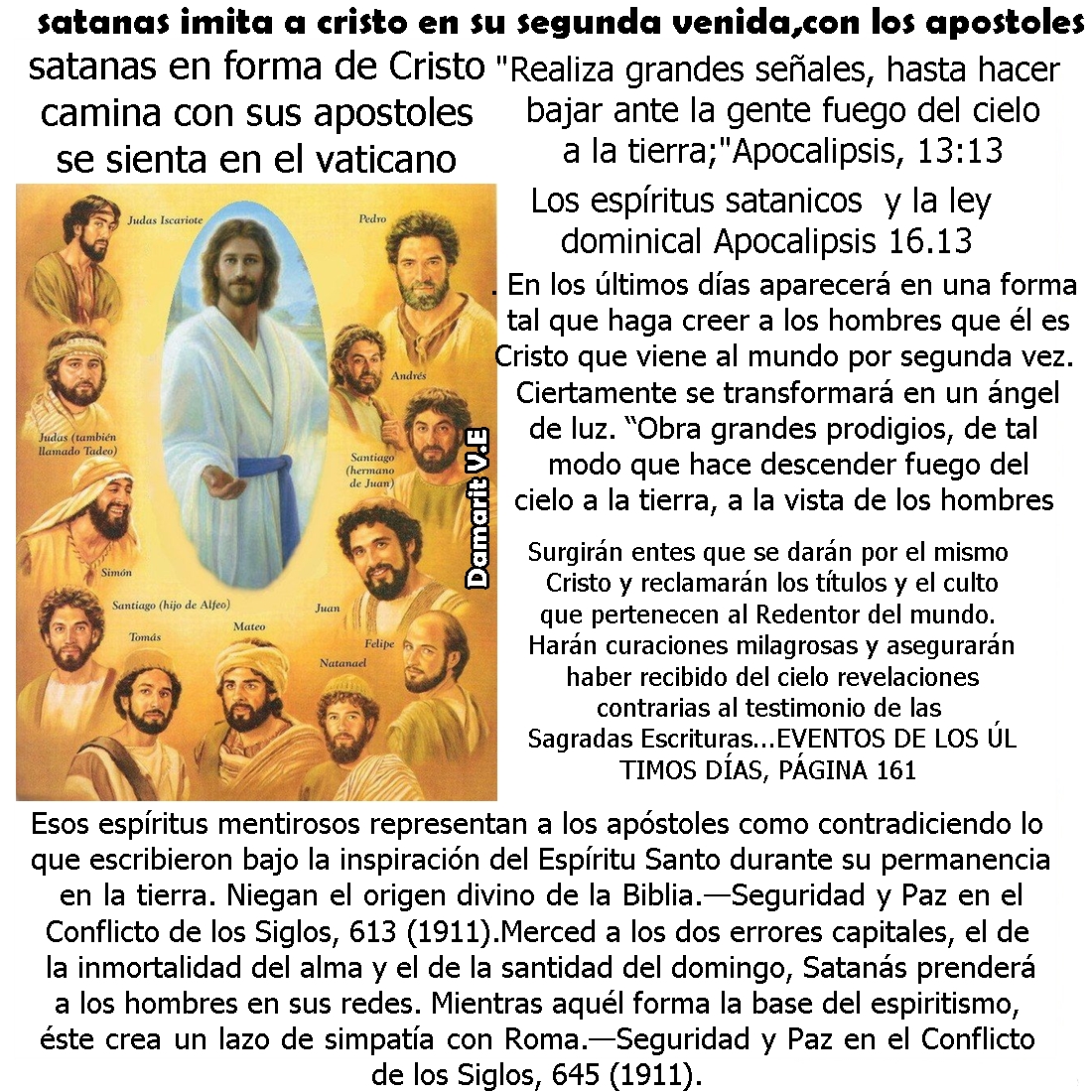 El pueblo se postrará en adoración ante él, mientras levanta sus manos y pronuncia una bendición sobre ellos como Cristo bendecía a sus discípulos cuando estaba en la tierra. Su voz es suave y acompasada aunque llena de melodía. En tono amable y compasivo, enuncia algunas de las verdades celestiales y llenas de gracia que pronunciaba el Salvador; cura las dolencias del pueblo, y luego, en su fementido carácter de Cristo, asegura haber mudado el día de reposo del sábado al domingo y manda a todos que santifiquen el día bendecido por él.—Seguridad y Paz en el Conflicto de los Siglos, 682 (1911). Escrituras. Necesitan comprender lo referente a la condición de los muertos; porque aún les aparecerán espíritus de demonios que se darán por sus seres queridos y parientes, y les enseñarán que el día de reposo ha sido cambiado, y otras doctrinas ajenas a la Biblia.—Primeros Escritos, 87 (1854).