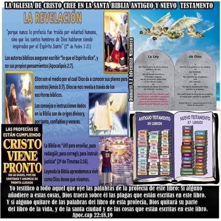 @dunkleosteus7er1l53 Los mensajes de los tres ángeles Daniel y Apocalipsis 14:6,13 —La proclamación de los mensajes del primero, segundo y tercer ángeles ha sido ordenada por la palabra de Inspiración. No ha de removerse ni un alfiler ni una clavija. Ninguna autoridad humana tiene más derecho a cambiar la ubicación de estos mensajes que el de sustituir el Antiguo Testamento por el Nuevo. El Antiguo Testamento es el evangelio en figuras y símbolos. El Nuevo Testamento es la sustancia. Uno es tan esencial como el otro. El Antiguo Testamento presenta lecciones de los labios de Cristo, y estas lecciones no han perdido su fuerza en ningún detalle. Es tan esencial que sean repetidos ahora a los que están buscando la verdad como lo fue en cualquier momento pasado. Por pluma y voz hemos de hacer resonar la proclamación, mostrando su orden y su aplicación a las profecías que nos conducen al mensaje del tercer ángel. No puede haber un tercero sin un primero y un segundo. Estos mensajes hemos de darlos al mundo en publicaciones y discursos, mostrando en la línea de la historia profética las cosas que han sido y las que habrán de ser.Apoc 15:2.Y vi también como un mar de cristal mezclado de fuego, y a los que habían triunfado de la Bestia y de su imagen y de la cifra de su nombre, de pie junto al mar de cristal, llevando las cítaras de Dios.LOS QUE NO ADORARON AL CATECISMO 666 DOMINGO FALSO DIA DE ADORACION MARCA DE LA BESTIA Y SU IMAGEN .ESCRITO ESTA EL PUEBLO DE DIOS CRISTO SELLADO PARA VIDA ETERNA .HEBREOS 4:4,9,11pues en algún lugar dice acerca del día séptimo: Y descansó Dios el día séptimo de todas sus obras.Genesis 1:1,2:1,4Exodo 20:8,11,Exodo 31:12,18Escrito con el dedo de Cristo.Hebreos 4:4,9,11Por tanto es claro que queda un descanso sabático para el pueblo de Dios. 10 Pues quien entra en su descanso, también él descansa de sus trabajos, al igual que Dios de los suyos.Mateo 24:20 Orad para que vuestra huida no suceda en invierno ni en día de sábado.(PERSEGUIDOS POR EL PAPADO ALIADOS 666 INQUISICION MUNDIAL )https://www.gabitos.com/Cristo_viene_preparate/general.php. |