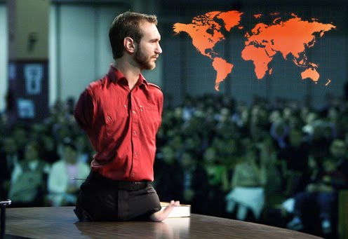 Mi nombre es Nick Vujicic y doy Gloria a Dios porque Él ha utilizado mi testimonio para tocar miles de corazones alrededor del mundo. Nací sin extremidades y los médicos no tienen una explicación científica para este “defecto” de nacimiento. Como te imaginarás, he tenido que encarar muchos cambios y obstáculos. “Consideren con alegría, mis Hermanos, todos aquellos problemas de diferentes tipos que tengan que enfrentar.” …. ¿Contar nuestro dolor y tristeza simplemente como fuente de alegría? Como mis padres eran Cristianos y, además, mi papá era Pastor de su iglesia, ellos conocían este versículo muy bien. Sin embargo, la mañana del 4 de diciembre de 1982 en Melbourne (Australia), las últimas palabras en la mente de mis padres eran “Gracias a Dios”. ¡Su primogénito había nacido sin extremidades! No tuvieron advertencias ni tiempo de prepararse para ésto. Los médicos estaban atónitos y no tenían respuestas para nada. No hay una razón médica de porqué esto sucedió, ahora tengo un hermano y una hermana que nacieron perfectamente, como cualquier bebé.