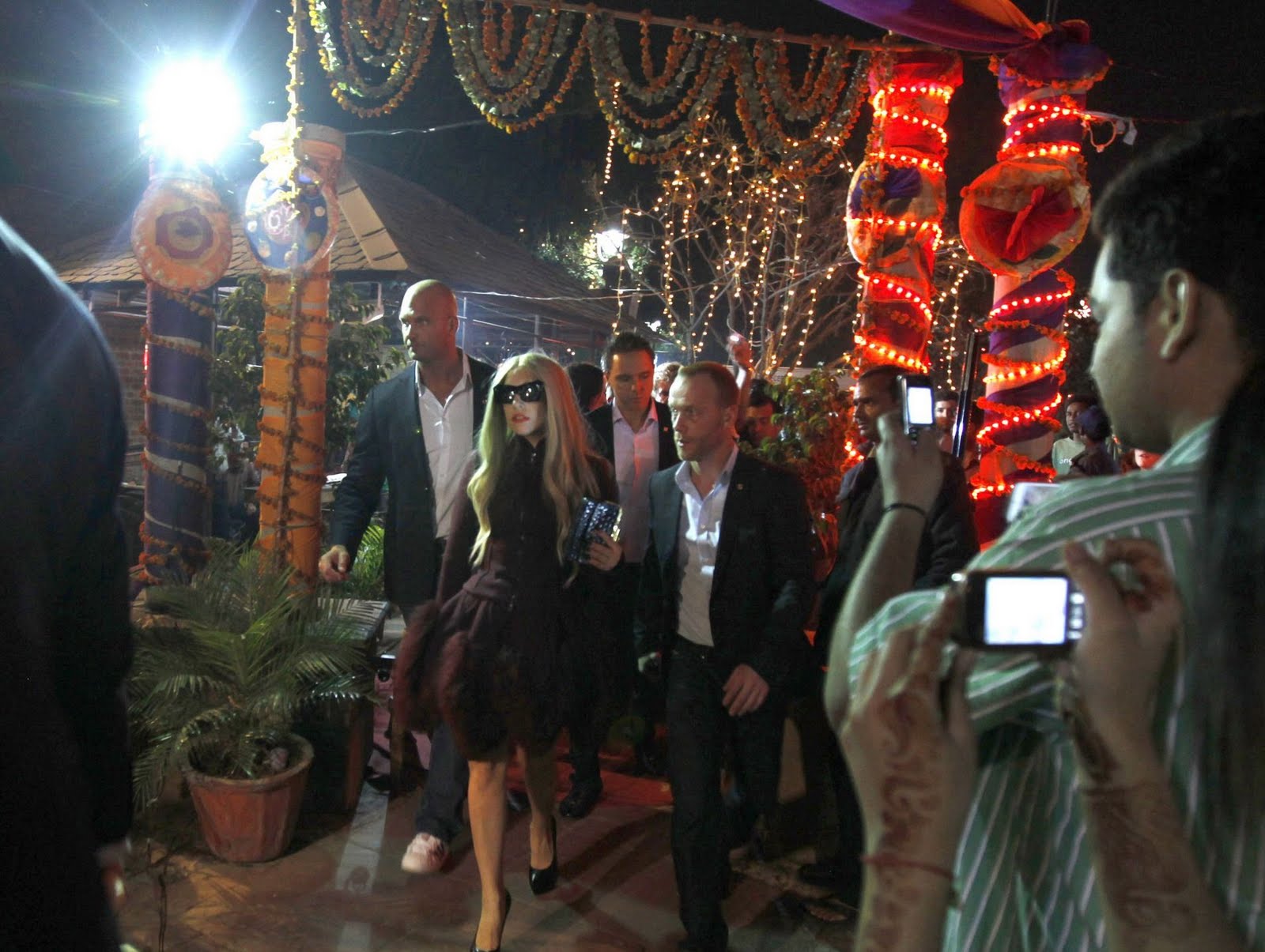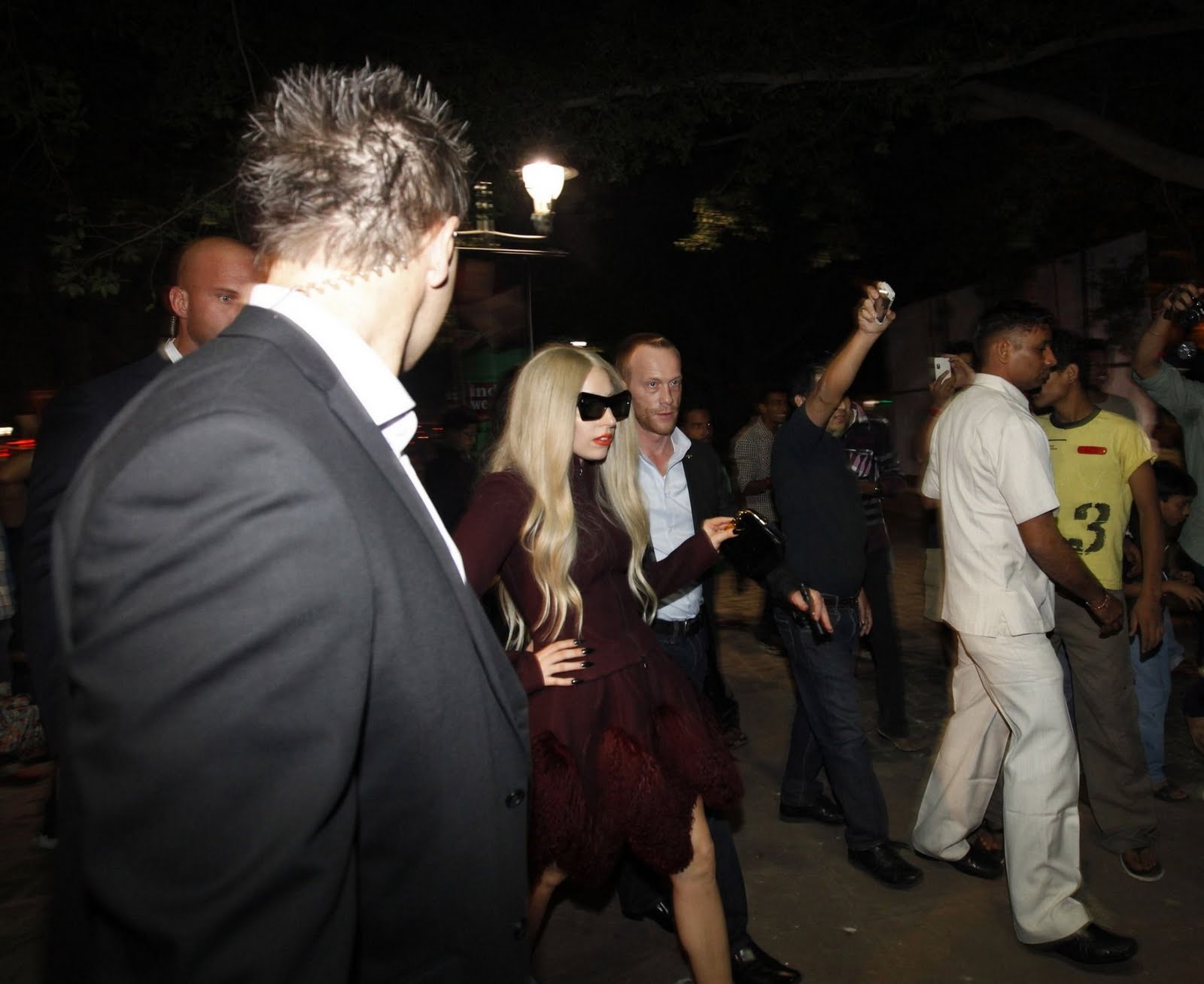 No pasar desapercibida. Ese es uno de los lemas vitales de Lady Gaga y en su último viaje, a la India, no iba a ser menos. La artista ofreció anoche un concierto al hilo del Gran Premio de Fórmula 1 en Noida, a 40 kilómetros de Nueva Dehli y convenció al millar de asistentes con un repaso a sus mejores éxitos. También con su estilismo, no el más excéntrico pero sí lo suficientemente llamativo para ser un look Gaga: falda de plástico blanca corta y drapeada, corpiño en tono nácar con cadenas doradas, medias de rejilla, botines rockeros, gargantilla de piedras XXL y un velo tupido a modo de capa. Pero más allá de la música, la arista ha querido aprovechar para conocer un poco Nueva Dehli y pasear por el mercadillo de artesanías Dilli Haat. Subida a unos tacones de Christian Louboutin 17 centímetros y con unas enormes gafas de sol «cat eye», Gaga conversó animada y cariñosa con los vendedores locales y se interesó por telas, fulares y colchas bordadas.