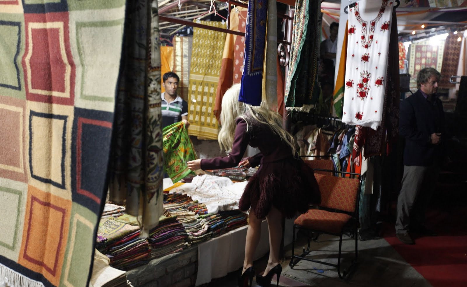E: ¿Has planeado ir de compras por Delhi? LG: Sí, iré hoy, un poco más tarde. Me encantan los trajes de joyas - de joyas falsas, de imitación. De cualquier parte. Mi madre siempre usaba perlas falsas, así que espero poder comprar algo así. Fuente: Lady Gaga Online