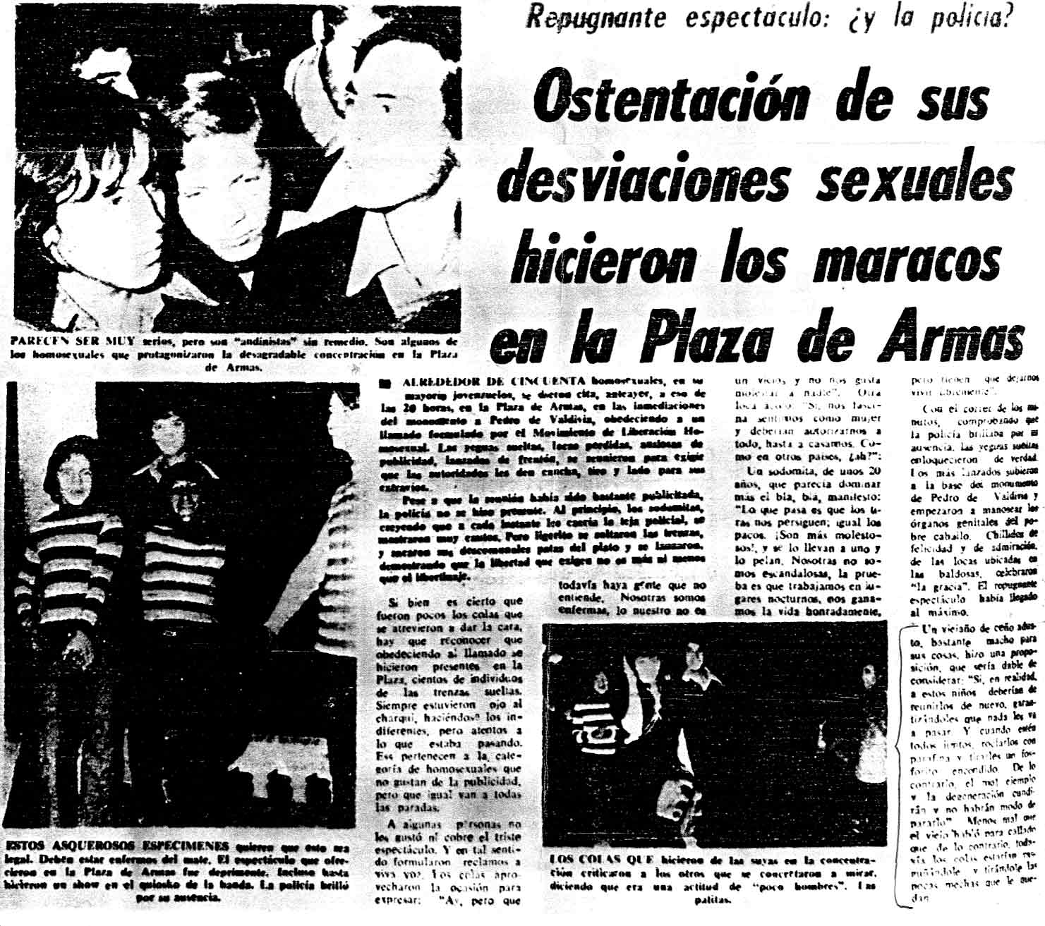 El domingo 22 de abril de 1973, unos meses antes del fatídico golpe militar, aconteció un político y simbólico hecho en la Plaza de Armas de Santiago que marcó la historia emancipada de la diversidad sexual en Chile. Ese día, enfrentando los prejuicios históricos, superando el miedo al qué dirán y eclipsando un tenso e intenso tiempo de revueltas varias, un grupo de travestis prostibulares decidió protagonizar la primera protesta homosexual en la historia nacional. La respuesta de la prensa de derecha e izquierda no se hizo esperar. “REBELIÓN HOMOSEXUAL: LOS RAROS QUIEREN CASARSE”, tituló sensacionalistamente revista VEA, mientras el popular diario Clarín, redactó incendiario: “Ostentación de sus desviaciones sexuales hicieron los maracos en la Plaza de Armas. Las yeguas sueltas, locas perdidas, ansiosas de publicidad, lanzadas de frentón, se reunieron para exigir que las autoridades les den cancha, tiro y lado para sus desviaciones. Entre otras cosas, los homosexuales quieren que se legisle para que puedan casarse y hacer las mil y una sin persecución policial. La que se armaría. Con razón un viejo propuso rociarlos con parafina y tirarles un fósforo encendido".