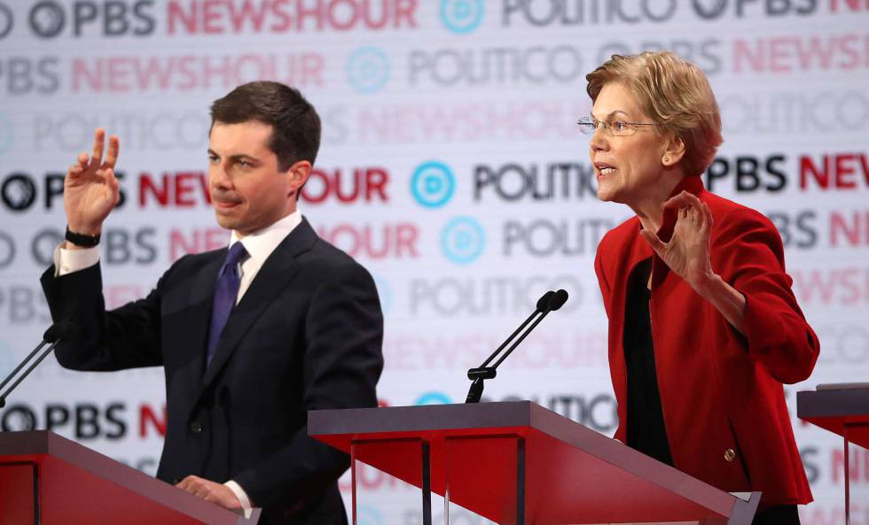 Buttigieg respondió con dureza. “Soy el único candidato en este escenario que no es millonario ni billonario” y se refirió a la fortuna personal de Warren. “Ese es el problema de poner pruebas de pureza que tú mismo no puedes pasar”. El rumor en la sala se oyó nítidamente. “Yo no vendo acceso a mi tiempo”, respondió Warren, “no me reúno a puerta cerrada con grandes donantes. Si no te puedes enfrentar a los ricos cuando eres candidato y lo tienes fácil cómo vas a hacerlo cuando seas presidente y te sea difícil”. Buttigieg le recodó entonces que ella hizo actos de recaudación de fondos anteriores a esta campaña y que está usando esos fondos.