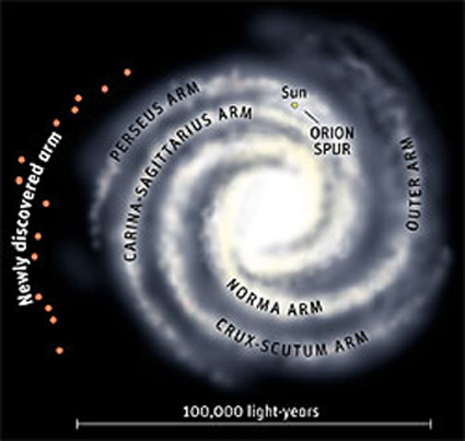 Imagen superior: Aspecto que se considera debe tener nuestra Galaxia, Vía Láctea. De sus brazos conocidos, nosotros nos encontramos en el denominado Brazo de Orion. Las estrellas más viejas (color rojas) se encuentran hacia el centro de la misma.