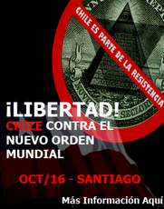 Por otra parte tenemos los enormes fraudes financieros que han hecho colapsar a naciones enteras, obligándolas endeudarse con instituciones tan oscuras como el FMI y el Banco Mundial, hipotecando con eso el futuro de millones de personas. Los únicos que se han beneficiado de todo esto son las grandes corporaciones financieras mundiales dirigidas por siniestros personajes que manejan los hilos, y que realmente toman las decisiones en el mundo manipulando a los gobiernos a su antojo. No sólo han quebrado el sistema económico a su beneficio, sino que buscan instaurar un modelo centralizado y totalitario, con el FMI al mando de los bancos centrales, con una moneda propia que reemplazará al dólar, los special drawing rights (SDR), e imponer su sistema como solución única al problema que han creado. Los recientes levantamientos en África del norte, desatando revueltas que sólo buscan generar el caos y después el intervencionismo europeo, son ejemplos de esta intención por instaurar un nuevo colonialismo. La manipulación de la humanidad a través de los medios de comunicación, que no hacen más que adormecer las mentes de aquellos que consumen televisión y entretención sin contenido, llevándolos a un estado de mundo virtual y consumismo salvaje, induciéndolos a dilapidar todos sus recursos económicos y morales con el afán de perseguir modelos de vida inalcanzables, trayendo como consecuencia que las personas se frustren y corten vínculos con su entorno social, el cual se refleja primeramente en la familia y luego en la comunidad. Mientras más aislado se encuentre el hombre, mas fácil será de controlar, la destrucción de la unión familiar y social, olvidando que todos juntos somos invencibles. Es difícil enumerar todos los cuestionamientos que buscan respuestas; transgénicos que invaden las tierras chilenas (UPOV91), la fluoración del agua, el estado policial y las leyes represivas en Chile y el mundo, y tantos temas más. Sin embargo, tendremos un espacio de expresión para el día 16 de octubre a partir de las 11:30. Nos en reuniremos en Plaza de Armas, donde se encuentra la estatua de Pedro de Valdivi para luego marchar desde por Ahumada hasta el Metro Universidad de Chile y de regreso hasta Plaza de Armas, para finalizar con un acto. Tendremos foros de debate, repartiremos información y por sobre todo estaremos en contacto con ustedes, nos conoceremos, compartiremos inquietudes y trataremos de buscar la verdad en este mundo de tanta convulsión social. MARCHAS EN REGIONES Y OTROS PAÍSES Si bien somos de Santiago, hemos querido participar no sólo con quienes se encuentran en esta ciudad, sino con amigos de regiones e incluso de otros países, y hemos abierto un espacio para ayudar a la coordinación de marchas fuera de Santiago para esta fecha: Para quienes no sean de Santiago Chile y deseen participar en esta marcha AntiNWO (gobierno mundial) del próximo domingo 16 de octubre, envíennos un correo a skyfind@verdadahora.cl con la siguiente información para ser representante de su área: - Nombre - Región donde vive (en el caso de ser del extranjero incluír país) - Lugar donde realizará la marcha (avenida “x”, plaza “x”, u otro donde se realizará) - Correo de contacto que utilizarán para la coordinación. Este correo será visible aquí, contacto y acercamiento entre quienes viven en el mismo lugar (pueden crear uno, o especificar si es el mismo desde el que envían el correo) - En Santiago realizaremos la marcha el 16 de octubre de 11:30 a 14:30 (-4GMT). Si en su localidad desean a otra hora, favor especificar. Los lugares de marchas fuera de Santiago serán avisados, a medida que se generen, en esta misma descripción de evento en el artículo de nuestra web y también por nuestro Facebook y Twitter. Sabemos que somos un puñado y que el enemigo al cual denunciamos es de dimensiones incalculables en recursos materiales, económicos y humanos. Sin embargo, esa incomparable diferencia hace que nuestra lucha sea más digna y valiosa. La invitación esta hecha, los esperamos con todas las energías que puedan contener en sus corazones para que con una sola voz digamos: no al nuevo orden mundial”.
