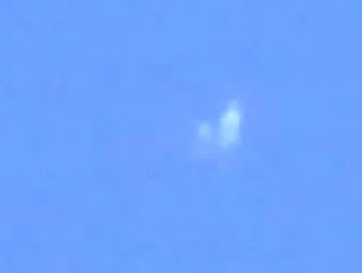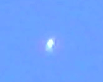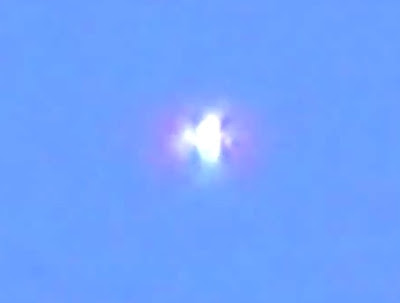 6. De repente el OVNI cambia de forma y el objeto de detrás adopta una morfología mas similar al OVNI de delante. Se observa un intercambio energético entre ambos cuerpos que se aprecia por el color azul turquesa de este fotograma.