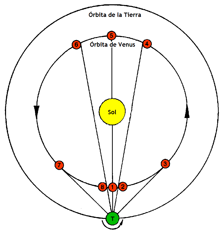 Cuando Venus se encuentra en la posición (1), es invisible, estando delante del sol. Entonces sale unos 4 días después en (2), cuando llega a tener un ángulo lo suficientemente grande con respecto al sol para ser apenas visible antes de la salida del sol, para desaparecer inmediatamente en la luz del sol. Venus entonces sale un poco más temprano cada mañana hasta que se convierte en un faro luminoso antes del siguiente punto (3), donde alcanza su ángulo máximo de más de 45º con respecto al sol. Continúa en una media de 263 días en total como estrella de la mañana, y luego desaparece en (4). Unos 50 días después sale en el punto (6) una muy tenue estrella vespertina, tenue porque se encuentra muy alejada de la tierra. Entonces dura otros 263 días, o casi nueve meses, como estrella vespertina antes de que desaparezca de nuevo en (8). A medida que se acerca a la tierra alcanza su máximo más brillante después de pasar el punto (7).