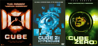 In the original movie, Cube, a guy wakes up trapped in a cube (we often call this “a room”) with hatches on each face, each of which lead to other rooms. In Cube 2, a woman is again trapped in the cube, but when she goes through a hatch, gravity is reversed. Others trapped in the rooms discover gravity is different in each room, things are just plain wacky in all of them, and declare that they’re in a hypercube/tesseract. In one room, they find a square floating, which turns into a tesseract. The tesseract sucks in one of the trapped victims and rips him apart. Then things get weird.