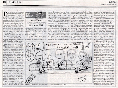 municipales 2011 José Salguero DuarteJueves 3 marzo 2011 http://salgueroduarte.artelista.com/ http://josesalguerod.blogspot.com/Diariamente escuchamos ciertas declaraciones políticas, que nos dejan cogiendo moscas, al creerse que somos imbéciles y nos tragamos todo lo que dicen. Sueltan unas perlas que no hay por donde pulirlas, como los slogans que llevan en sus campañas electorales. Y para muestras los siguientes de las diferentes formaciones políticas algecireñas para las elecciones municipales de mayo próximo: Rafael España del PSOE: ‘Para Algeciras respuestas'; Inmaculada Nieto de IU: ‘Sobran razones muévete'; Hermenegildo González del PA: ‘Lo primero Algeciras' y por último José Ignacio Landaluce del PP: ‘Algeciras necesita el cambio’.Desconozco, quiénes les han diseñado a los socialistas algecireños la campaña electoral. Porque, bajo mi entender, es contraproducente contra el propio partido socialista, porque la población lleva años esperando numerosas respuestas del PSOE algecireño, sin que lleguen de una vez por todas. Por lo tanto, pienso, que el PSOE con Rafael España, no mantendrá y menos crecerá en expectativas de votos, porque él ha permanecido años realizando las funciones de subdelegado de la Junta de Andalucía del Campo de Gibraltar. Y bajo mi entender ha brillado casi por su ausencia, su labor política realizada.Por lo que, don Rafael, creo con los respetos que usted se pueda merecer, que no tiene credibilidad política alguna ante el electorado algecireño, porque no está ya ni para coger la tiza, al no convencer ni a su propia familia política. Y es por lo que, tanto usted como los suyos, de no salir airosos en las elecciones municipales de mayo, van a durar menos en el PSOE que una pompa de mistol. Cosa que aplaudiré, porque son necesarias jóvenes energías, para renovar y desinfectar el socialismo local, al estar presuntamente contaminado por ciertos rodillos políticamente incorrectos.En cuanto al slogan de la señora Inmaculada Nieto de IU, me huele a letra rancia de Triana Pura: ‘Queé le tá pazando al probe Manuel. La larala la la. La lara la la'. Porque en estos cuatro años IU se ha movido poco dando una penosa imagen en el poder, al ser la comparsa política que ha acompañado en el Gobierno municipal algecireño al PSOE de Rafael España.Por lo tanto, el slogan de IU en esta campaña electoral municipal lo considero impresentable. Y lo digo pidiéndole perdón a tantos militantes de IU y del PC, que lucharon por una izquierda real y no la izquierda hundida y desunida que tanto usted doña Inmaculada y los suyos han creado con sus desatinos políticos. Y es por lo que me sobran razones, para no votar a IU de Algeciras mientras usted la lidere, porque para que negocie políticamente con mi voto como lo ha hecho en esta legislatura, se lo doy directamente a una de las formaciones mayoritarias.El slogan del PA de Hermenegildo González dice: ‘Lo primero Algeciras’. Pienso que segundas o terceras partes nunca fueron buenas, pero no me extrañaría lo más mínimo, que tras las elecciones municipales de mayo, el PA se convierta en el partido bisagra para formar equipo de Gobierno. Cosa que aplaudiré, porque todo lo que huela a andaluz, viene muy bien a nuestros sentimientos patrios andaluces.El slogan del PP, del diputado nacional y candidato a la alcaldía José Ignacio Landaluce dice: ‘Algeciras necesita el cambio’. José Ignacio, es el político más valorado. Por lo tanto, si su formación sale ganadora, le deseo mucha suerte, porque la va a necesitar, ya que Algeciras y Andalucía necesitan un cambio radical. Y lo digo pensando como lo hacen en Cádiz -cuna del constitucionalismo español-, ya que a pesar de ser un pueblo luchador y reivindicativo de izquierda, llevan muchos años eligiendo una alcaldesa del PP. Demostrando el pueblo gaditano, que por encima de las siglas políticas están las personas, que es lo que deberíamos votar. Y no, a los que las formaciones nos metan en listas cerradas, a través de la ley electoral creada interesadamente por las grandes formaciones políticas españolas.