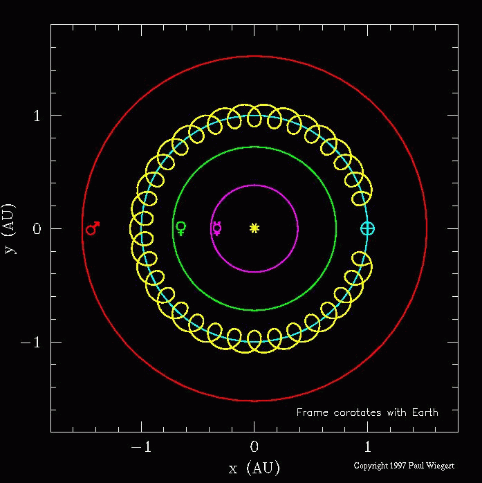 Antes de considerar el movimiento de Cruithne, vamos a examinar una situación menos complicada. Abajo vemos el tipo de órbita en herradura más simple que es posible para un asteroide hipotético. Sólo se muestran las órbitas de los planetas interiores del Sistema Solar. Se los ha identificado con su símbolo tradicional y son, desde el Sol hacia fuera: Mercurio (violeta), Venus (verde), la Tierra (celeste) y Marte (rojo). El recorrido del asteroide se ve en amarillo.