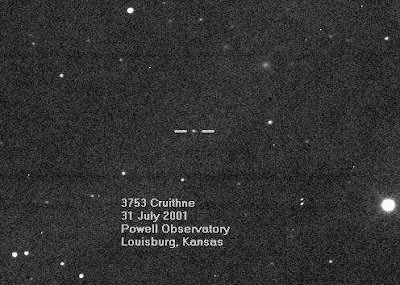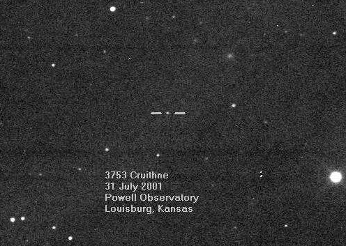 Fotografía del asteroide 3753 Cruithne (entre los dos guiones).