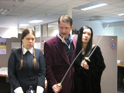 Si vas a una fiesta con tu pareja y no tienes muy claro el disfraz aquí el socorrido disfraz de la familia Adams, en casi todos los armarios hay un vestido negro una falda larga o algo apropiado para vertise de Morticia, lo que "termina" de hacer el disfraz es la peluca, para eso tendrás que ir a alguna tienda de disfraces (en todo a 1 euro tiene para salir del paso) y comprarte una. El hombre con cualquier traje, un bigote y un buen puro, peinado con gomina o brillantina y ella con un maquillaje de estilo gótico, aclarar cutis, remarcando ojos y labios y dandole profundidad a los pomulos.