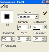 Enseguida vas a tu lienzo y colocando la punta de tu pincel encima del primer cuadrito, calculas el tamaño que llevara el centro de tu cuadro a fin de que quede un margen alrrededor de este.....si la punta es muy grande, disminuyes el tamaño en la paleta de configuracion o lo aumentas si es muy chico.