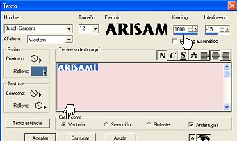 Una vez abierta la ventana del texto, asegurate de buscar un color de fondo para tu texto, un tipo de letra facilmente legible y de preferencia que sea en mayusculas, aumenta el espaciado entre letras lo mas posible, asegurate de que el tamaño del texto va de acuerdo al tamaño de tus cuadritos y marca la opcion "Vectorial".
