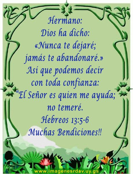 AMEN, GRACIAS MI DIOS POR ESTE NUEVO DIA, ESPERANDO SEÑOR Q TE GLORIFIQUES EN MI HNO DAVID Y TE LLEGUES AQUEL LUGAR DONDE SE ENCUENTRE Y EL PUEDA SENTIR TU PRESENCIA Y EXTIENDA TU MANO DE SANIDAD SOBRE EL, EN EL NOMBRE DE JESUS TE LO PEDIMOS. GRACIAS SEÑOR PORQ POR FE LO CREEMOS Q TU TE VAS A GLORIFICAR. EN TU VOLUNTAD, GRACIAS. AMEN. |