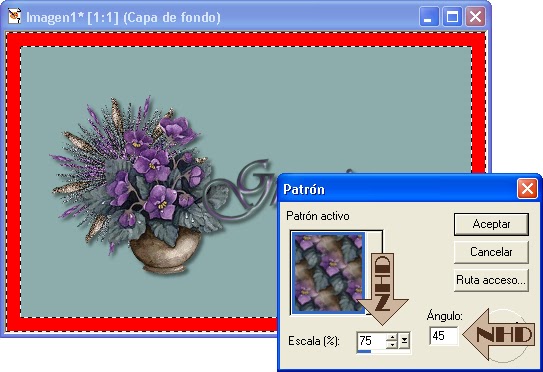10.- Sobre el costado derecho, en donde fijamos los colores que usamos para escribir las letras, en el rectángulo que corresponde al Relleno, que se llama COLOR DE FONDO, ponemos un color cualquiera (que después no se va a ver) que sea bien distinto al color de la tarjeta (yo puse el rojo) y hacemos: Imagen - Agregar Borde Simétrico, en este caso de 15 pixeles.