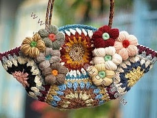 BOLSA EM SQUARES E FLORES DE CROCHE