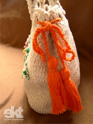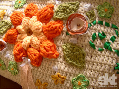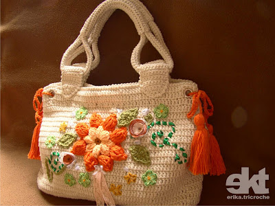 lsa de croche maravilhosa, na verdade não imaginei que iria ficar tão linda, pensei em uma bolsa simples, bem simples! rsss. Quando minha prima Marília, veio em casa, dizendo que gostaria de dar uma bolsa de presente para a tia do namorado Rodrigo. A princípio ela me falou que queria uma bolsa estilo bolsa Dublin - Gerard Darel - a famosa bolsa usada por Angelina Jolie, sem os detalhes das bolinhas que a bolsa tem. Muito simples mesmo!!! A exigência era que tivesse flor laranja com os pingentes laranjas, porque é a cor preferida da tia.
