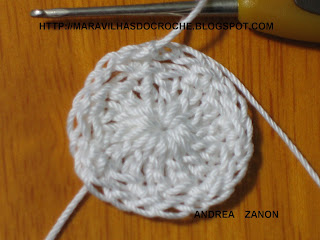 1 - Com a linha na cor de sua preferencia eu usei a linha na cor Branca dê uma volta de linha no dedo e faça nesse anel 14 pontos altos e feche com ponto baixissimo.