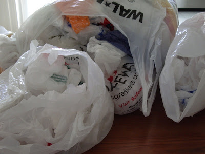 Me gusta volver a utilizar las bolsas de plástico de supermercado que tengo en el supermercado. Hay veces que tengo tantas que terminar con los problemas de almacenamiento terrible. Hace años que los había metido en un par de los titulares de tejido tubular bolsa de la compra hasta que ambos se rompió. Nunca me ha gustado mucho los titulares porque no hacen nada para reducir el volumen.Desde entonces, he estado relleno en otras bolsas de la compra como se puede ver en la foto de abajo. Este método es el peor absoluto y es muy voluminoso.