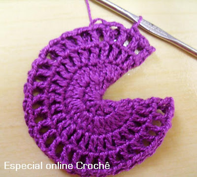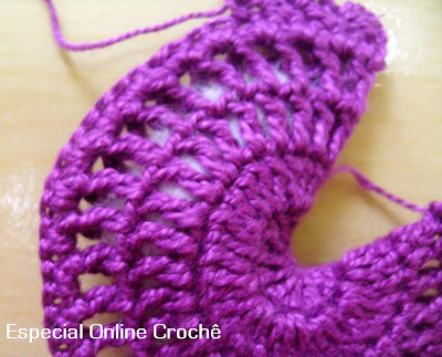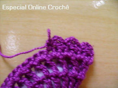 siguiente de la carrera, un punto alto en cada punto alto con una corriente de espacio entre ellos. Por último, para llegar a cuerpo, haciendo 2 sc en cada espaço.Arremate.