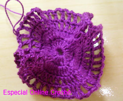 Terminar y empezar las ruedas. 5 cadenas, cerrar el círculo círculo.No, haciendo 15 puntos más.