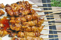 Ensartar los trozos de pollo, en pinchos bien de bambú o metálicos. Pintar los pinchos con la leche de coco justamente antes de ponerlos en las brasas de carbón vegetal.