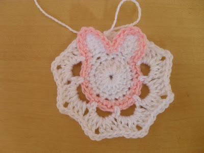 Mudar novamente para a cor do coelhinha e fazer 6 p.a separados com 1 correntinha seguidos por 3 p.a separados com 1 correntinha fazer assim até o final.