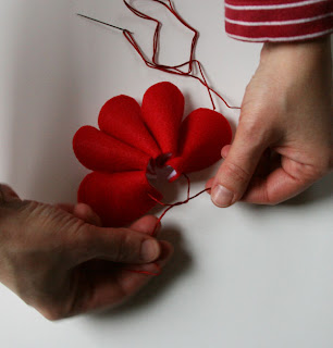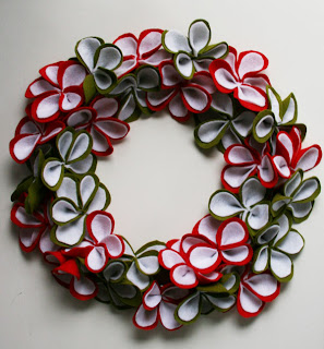 Así que aquí está el plan de juego! Materiales: 1 corona de metal de un tamaño de 14 pulgadas ($ 2,70) 8 hojas de fieltro (tamaño 9 "por 12") Rojo (alrededor de $ 0.30 por hoja) 8 hojas Felt (tamaño 9 "por 12") Green6 hojas de fieltro (tamaño 9 "por 12") blanco 1 bolsa de 144 ramas de acebo ($ 1.99) del hilo de bordado y una aguja Procedimiento: . 1 Imprima este patrón y cortar los pétalos