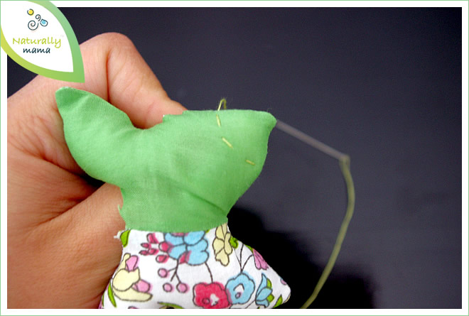 b) empuja el balón en la punta del tallo. Vuelva a llenar en la aguja denso o de doble cadena. Deducir que de adentro hacia afuera, como se muestra en la foto, a través de dos capas de tela (donde los márgenes de costura fuera).