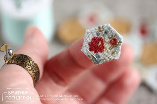 Top cojines cosidos a mano de pequeños hexágonos, sólo caben en la punta de un dedo (el "Anillo Único" de la izquierda no se presta atención, simplemente pulse el cuadro). :-)